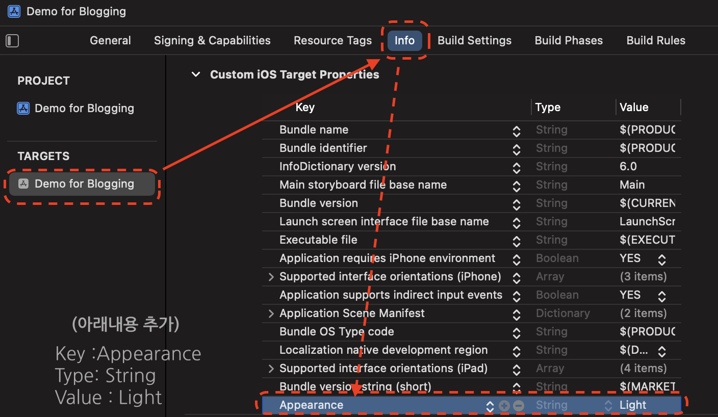 좌측 프로젝트 아이콘(Target) → Info → Key 추가 (Appearance) / 아래 이미지 참고해주세요